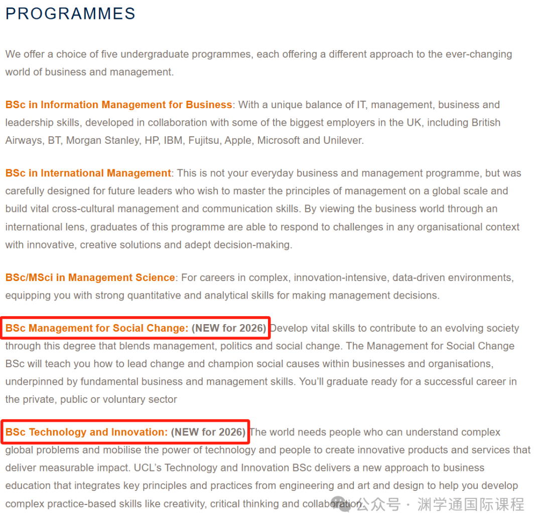 果不其然,继2024年推出了全新的国际管理专业之后,UCL管理学院于近日又官宣——将在2026年开设两个全新专业,自此,UCL管理学院一共开设五大专业↓