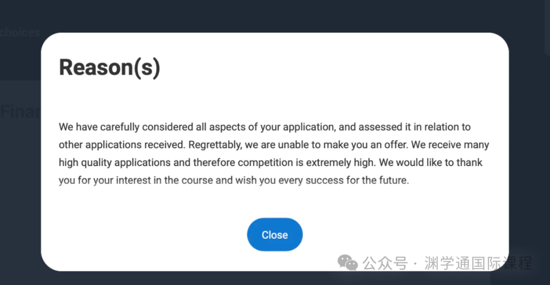 遗憾的是,我们无法向您提供录取机会。我们收到了许多高质量的申请因此竞争非常激烈。我们感谢您对该课程的兴趣,并祝愿您未来一切顺利。“