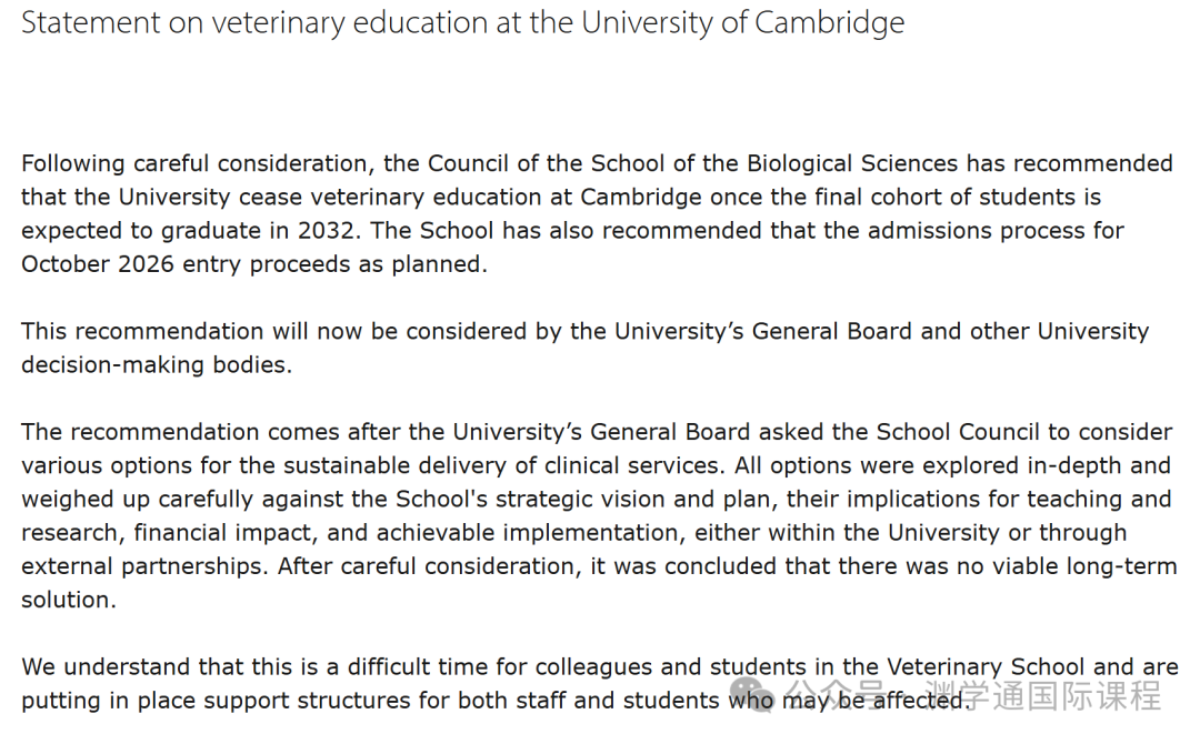 声明明确指出,2026年10月入学的兽医专业招生工作将按原计划进行,最终停办节点锁定在2032年最后一届学生毕业之后——也就是从2027年申请季开始,剑桥将不再接受兽医学本科申请。
